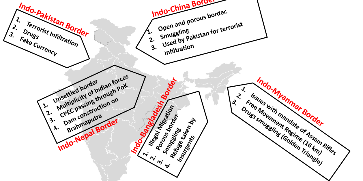 India has a multidimensional border management problem. It has long land and coastal borders of 15000 Km and 7500 km app. respectively. Many Indian states have long coasts. Managing land borders is very different from managing coastal and riverine borders. In the Indian context, a few features stand out. India has 4096 km of border with Bangladesh, 3323 km with Pakistan, 3488 Km with China, 1751 km with Nepal, 699 km with Bhutan, 1643 km with Myanmar. Sections of the boundaries are unsettled. The neighbors are often hostile. Terrains are diverse and difficult. Border areas are underdeveloped. Connectivity with the hinterland and across to other countries is poor. Border populations feel insecure. Borders areas in remote parts are getting depopulated. Illegal migrations, which alter demographic ratios, present a major challenge.